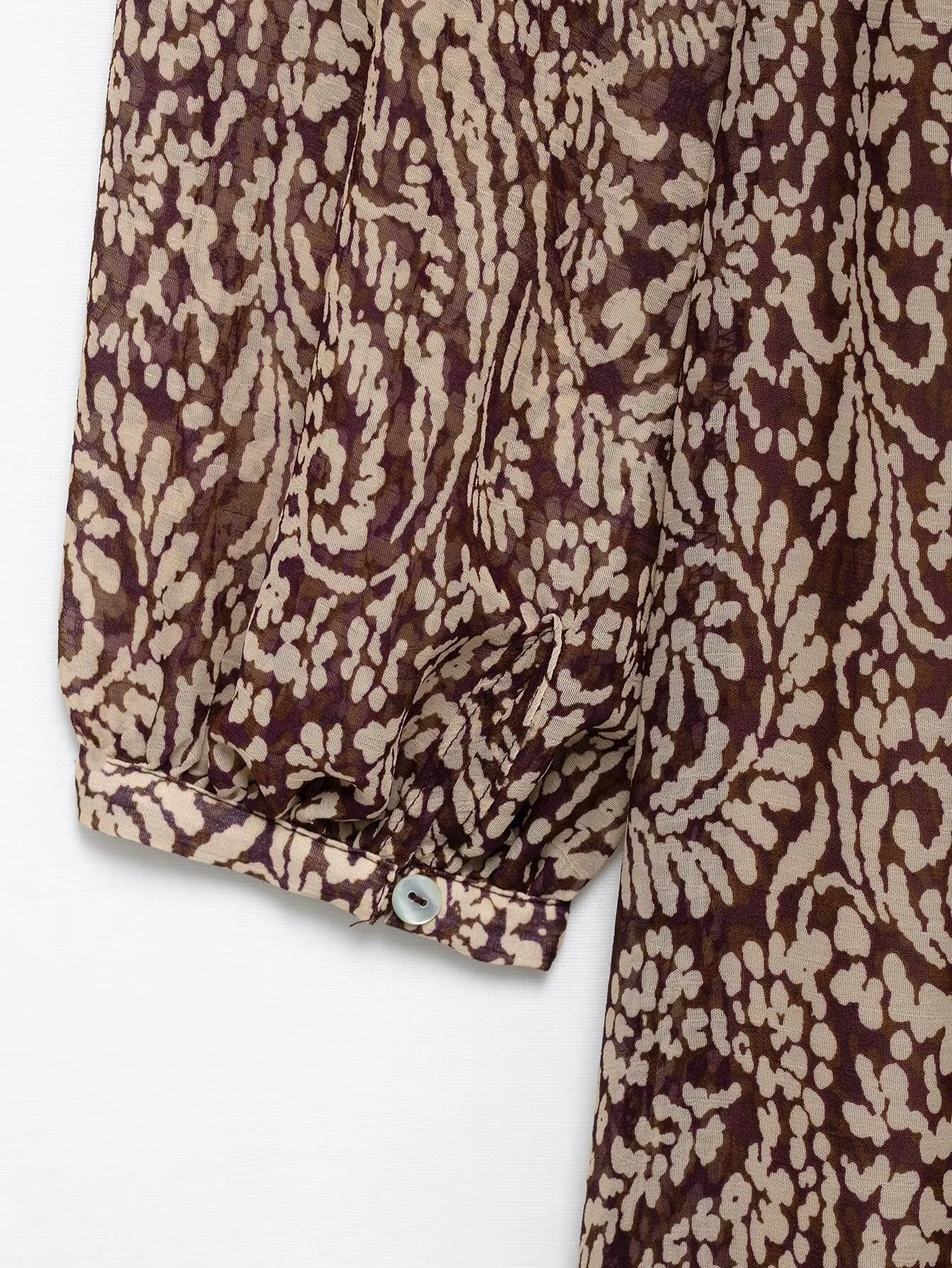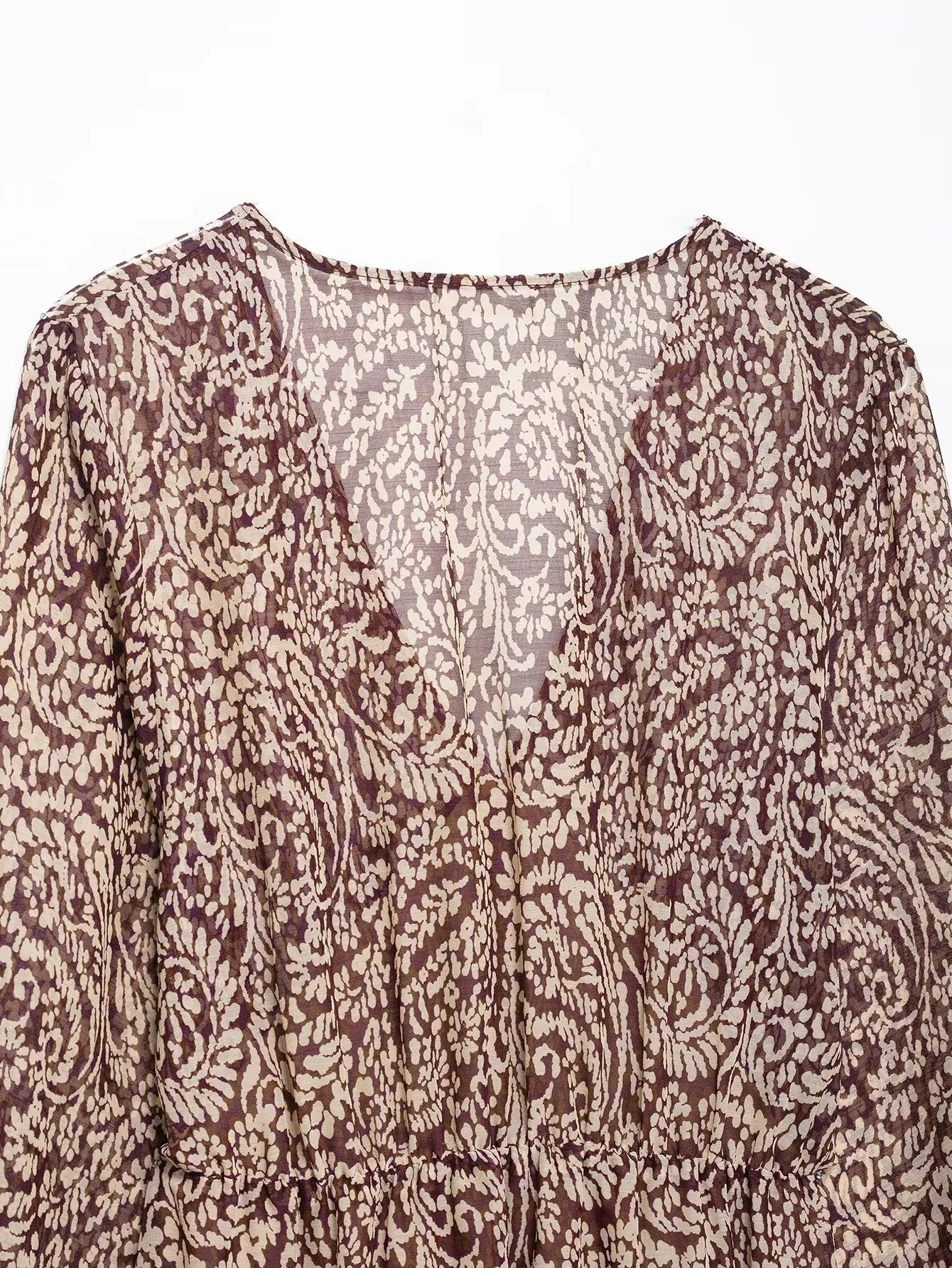فستان متوسطي بنقشة ريترو، بياقة V وتصميم متدرج أنيق، مثالي للربيع.