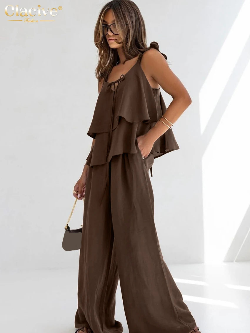 طقم نسائي من قطعتين من القطن الأبيض الفضفاض من Clacive صيفي 2025، مكون من بلوزة بدون أكمام مع بنطلون واسع وخصر مرتفع للنساء