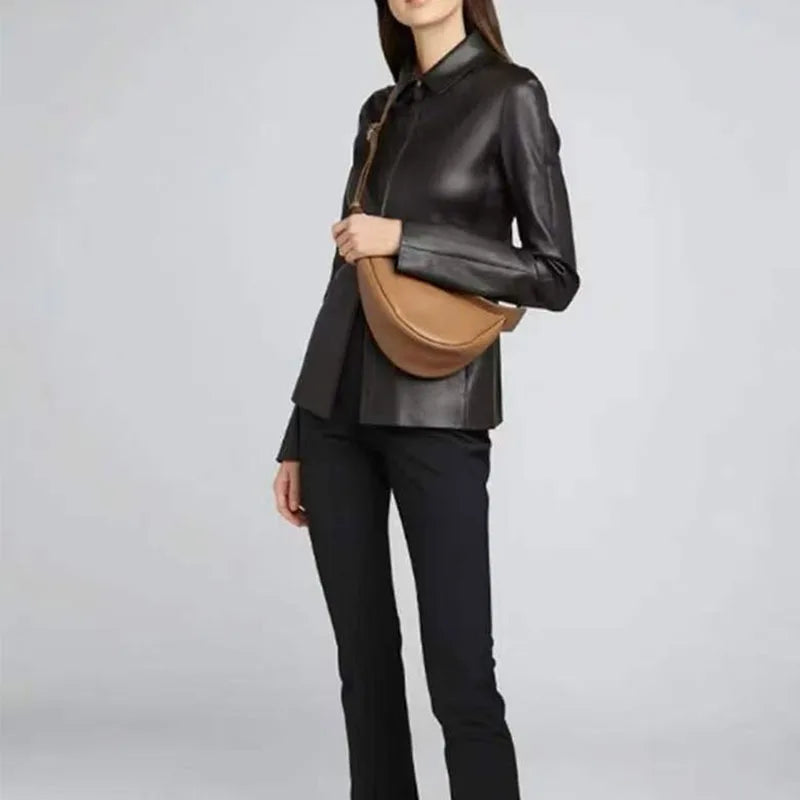 حقيبة يد نسائية جديدة من الجلد الطبيعي، الطبقة الأولى، مصنوعة من جلد العجل المحبب البسيط، بتصميم نصف قمري فريد من نوعه
