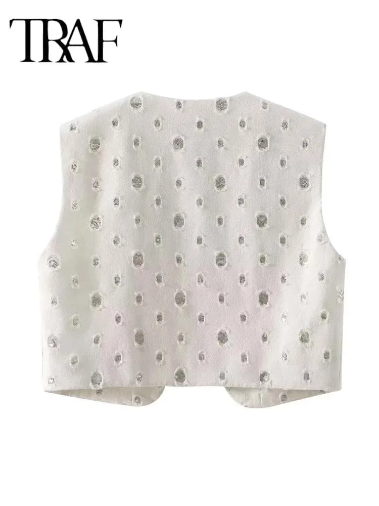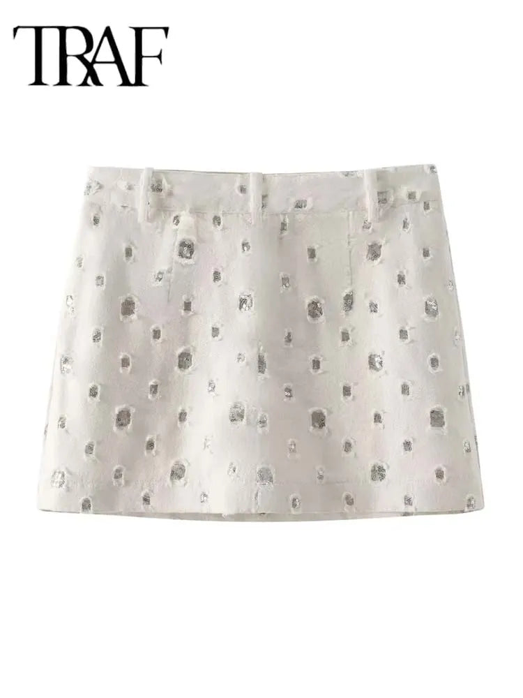 طقم تنورة أنيقة مزينة بالترتر من TRAF للنساء، مكون من قطعتين، صدرية لامعة بدون أكمام، طقم تنورة بسحاب، موضة صيف 2024